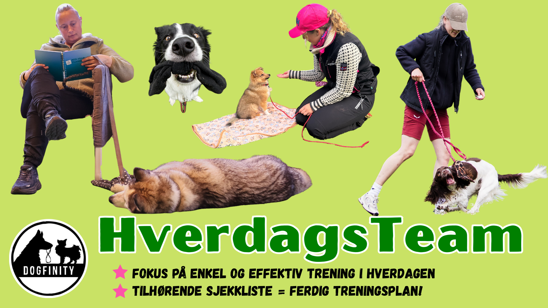 Eksempel på øvelser/innhold: Pausestasjon, impulskontroll, innkalling, båndtrening, passering, aktivisering, rotrening, spor, søk - og mye mer.